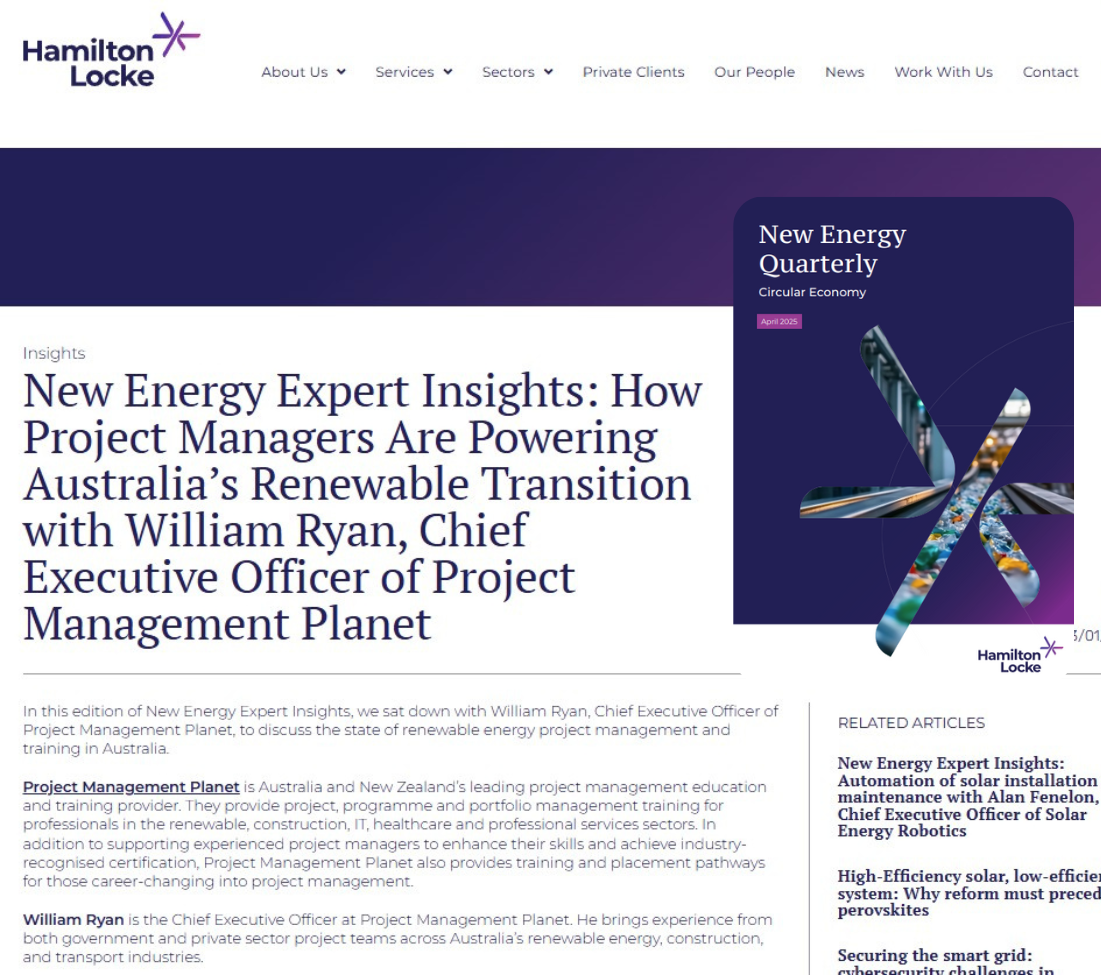 Project Management Planet was recently interviewed by New Energy Quarterly, Australia’s leading renewable energy publication, to discuss the state of renewable energy project management and training in Australia.